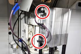 Disconnect the 1/4 in. air lines from the top and bottom push-to-connect fittings on the power drawbar cylinder.