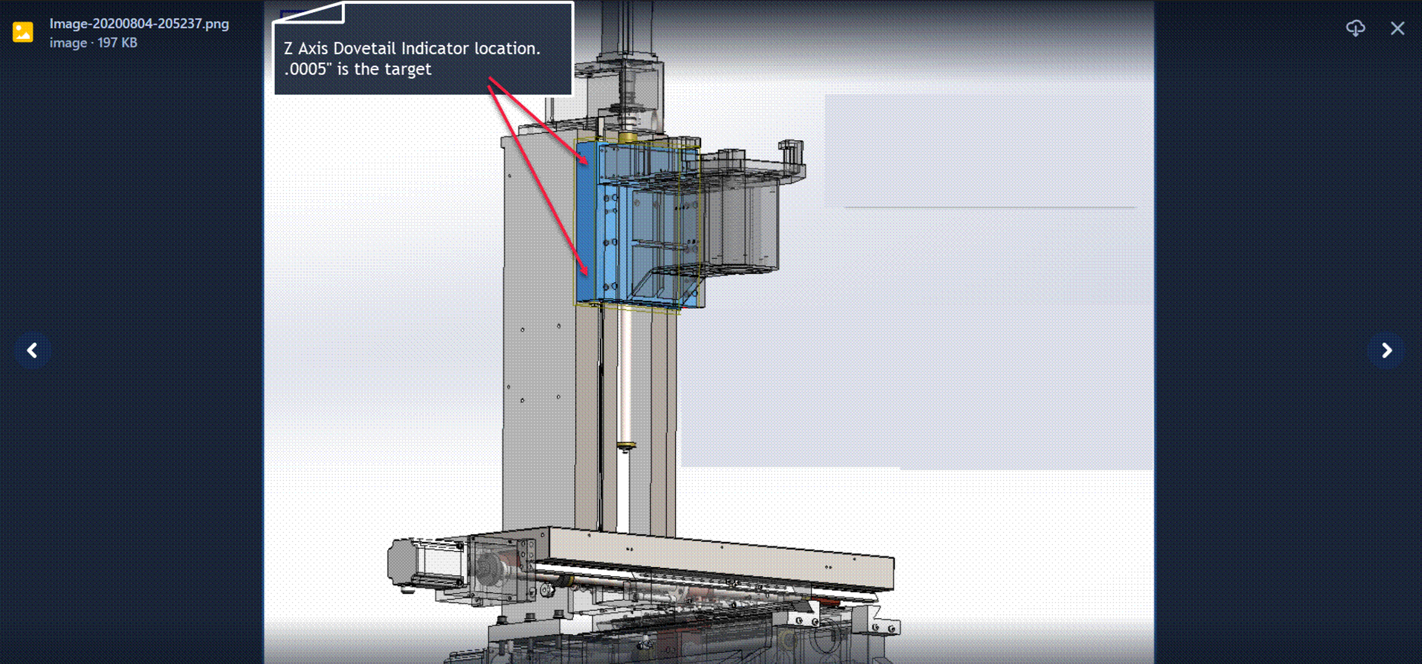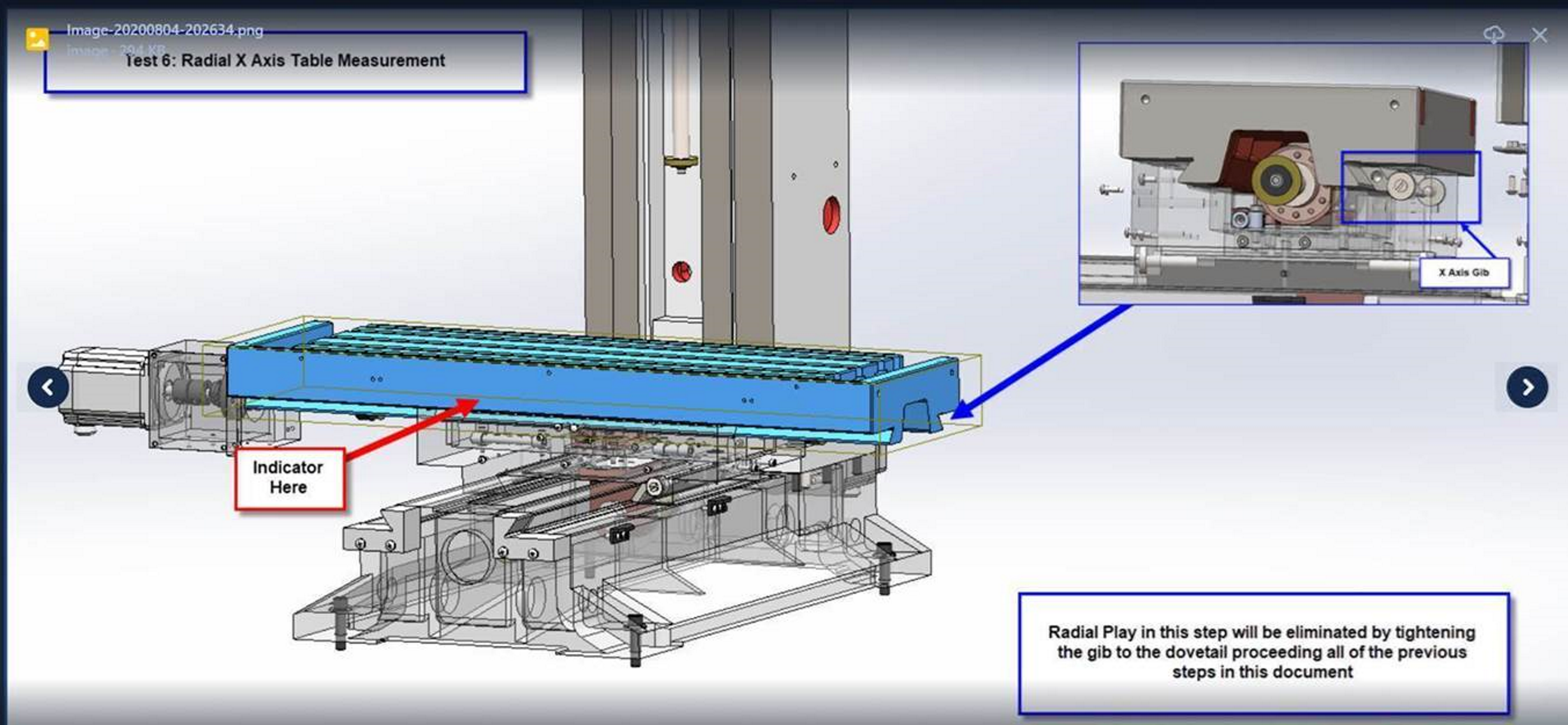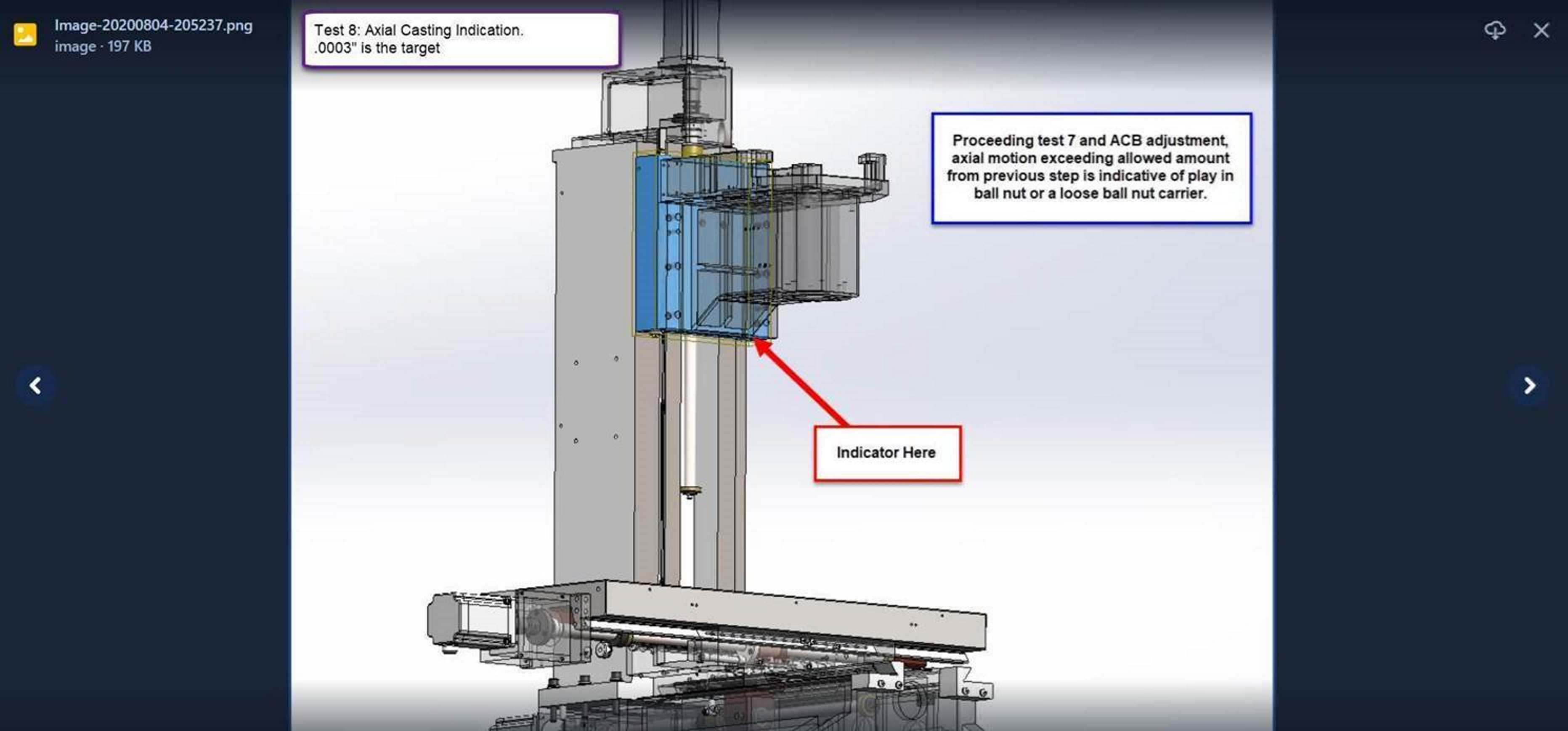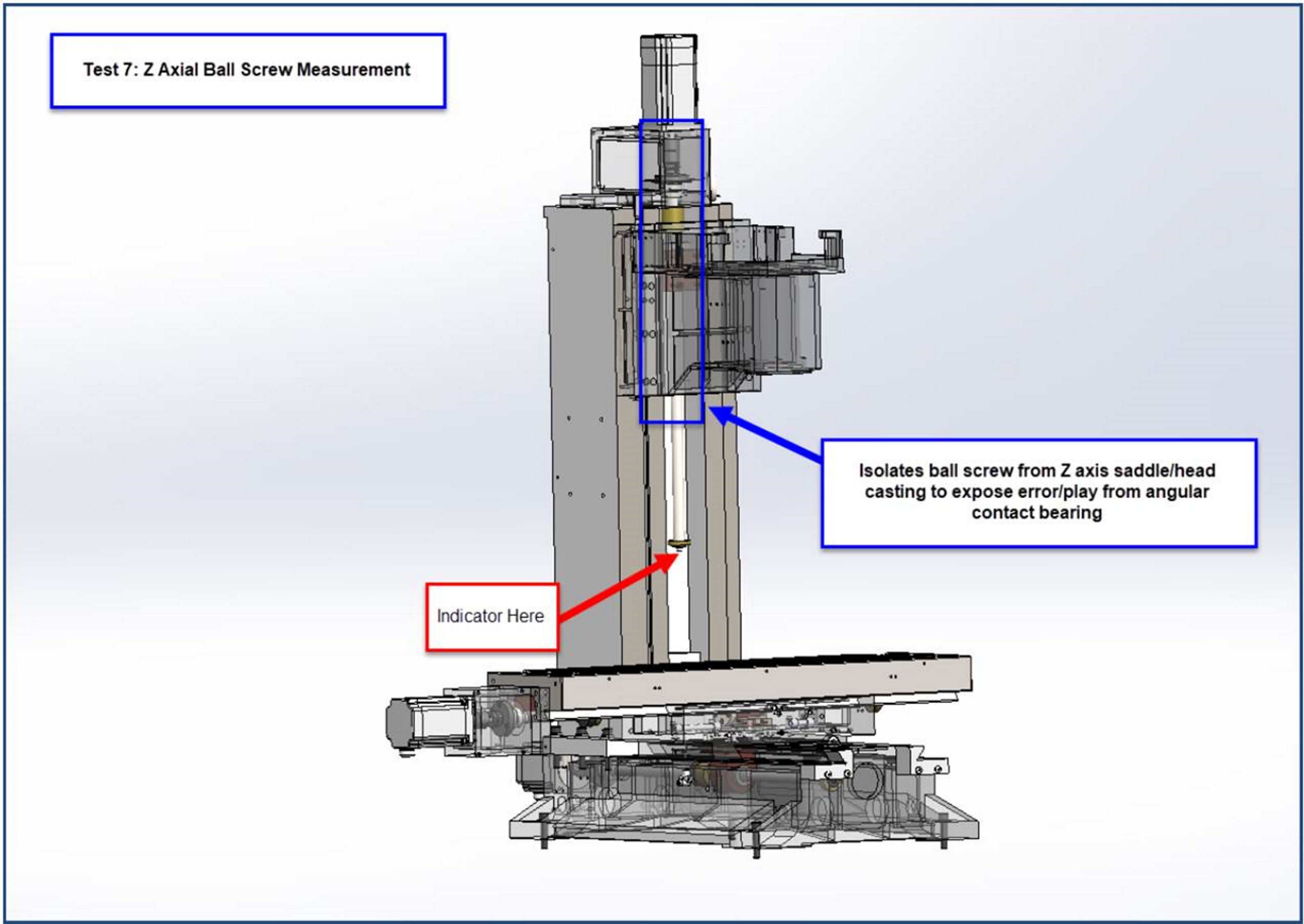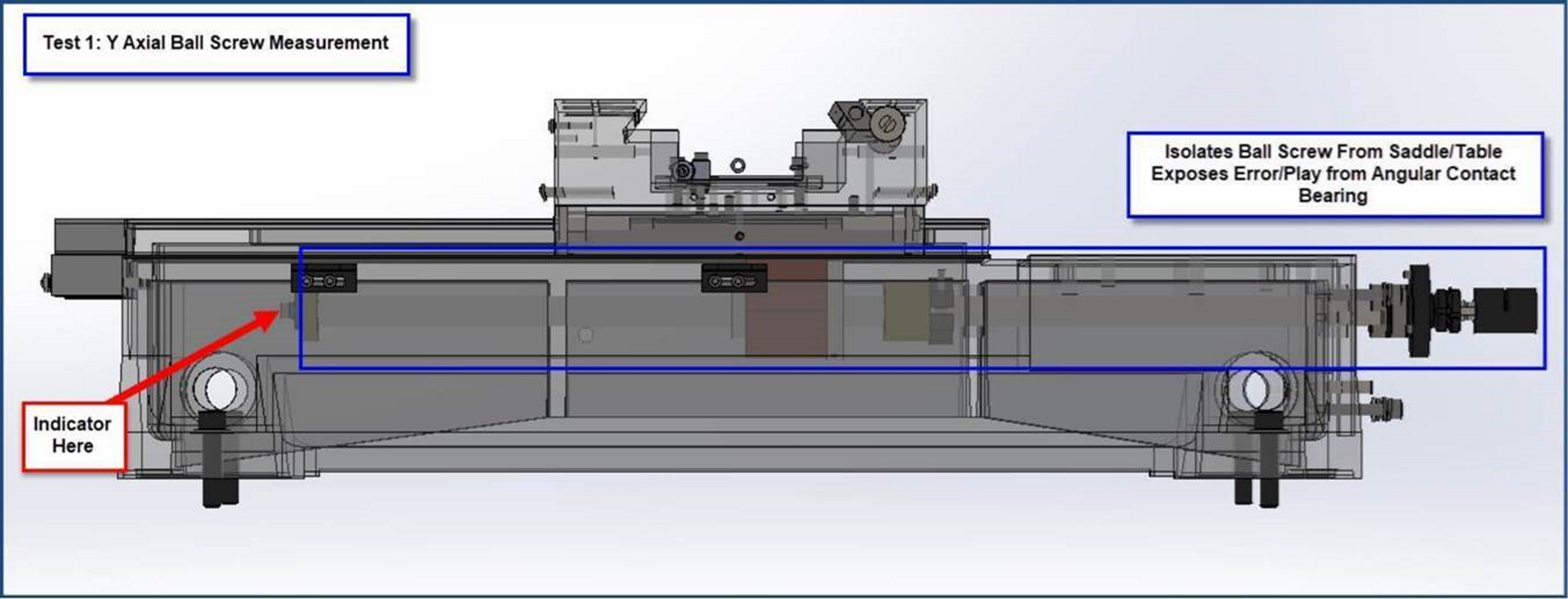 Dial Travel Indicator with Mag Base on Lower Machine Base/Chip Tray, and indicator on front side of ball screw. Shake table/ball screw from front to back.