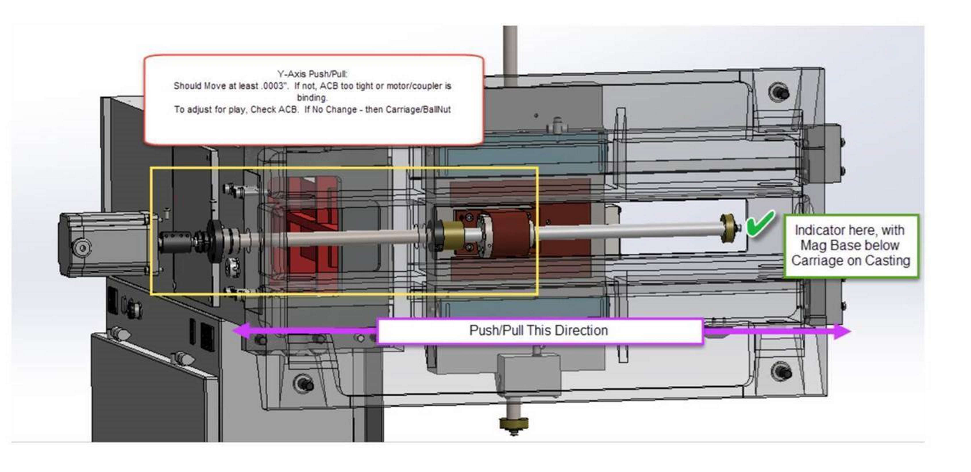 Dial Travel Indicator with Mag Base on Lower Machine Base/Chip Tray, and indicator on front side of ballscrew. Shake table/ball screw from front to back.