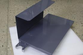 Find the keyboard tray provided. Then, attach the remaining mount arm bracket to the left side of the keyboard tray with two M4 × 0.7 - 10 screws using a 2.5 mm hex wrench. Verify that the curved edge is facing away from the keyboard tray.