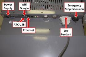 Find the provided power, Ethernet, emergency stop extension, and ATC USB extension cables, and the WiFi dongle. Then, connect them – and the jog pendant cable – to the controller as shown in the following image.