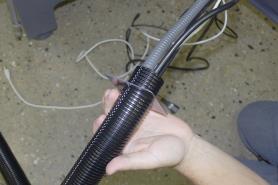 Figure 19: Cords put into corrugated tubing, which is attached to the rear of the keyboard tray.