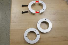Find the three provided split collars. If they're connected, remove their bolts using a 8 mm hex wrench, and separate them. The split collars are matched pairs, so you must keep them together.