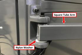 Secure the square tube arm to the machine stand with two M8 socket head cap screws, two M8 flat washers, two M8 lock washers, and a 6 mm hex wrench. Verify that the white nylon washer is located toward the bottom of the mounting pad.