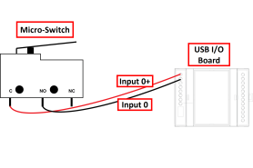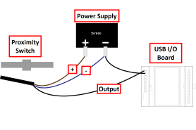 You can use an NPN (sinking) proximity switch by sharing the power supply ground with the USB I/O board’s 0 input. Wire the proximity power and route the load to the 0+ input.