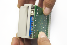 Snap the base on to the bottom of enclosure and attach the cover plate to the top of the enclosure. Make sure the text on the sticker matches the terminal block locations and the USB port on the control board.