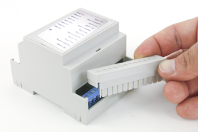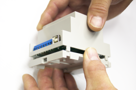 Snap the DIN rail latch into the bottom of the base; you can use the hook to mount the USB I/O module on the DIN rail in the electrical cabinet.