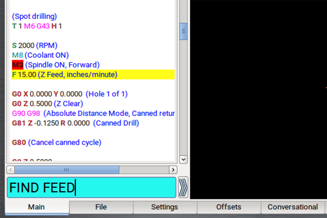 You can use PathPilot to search the text of a G-code program file for specific numbers, codes, or other items of interest (like tools, feeds, and speeds).