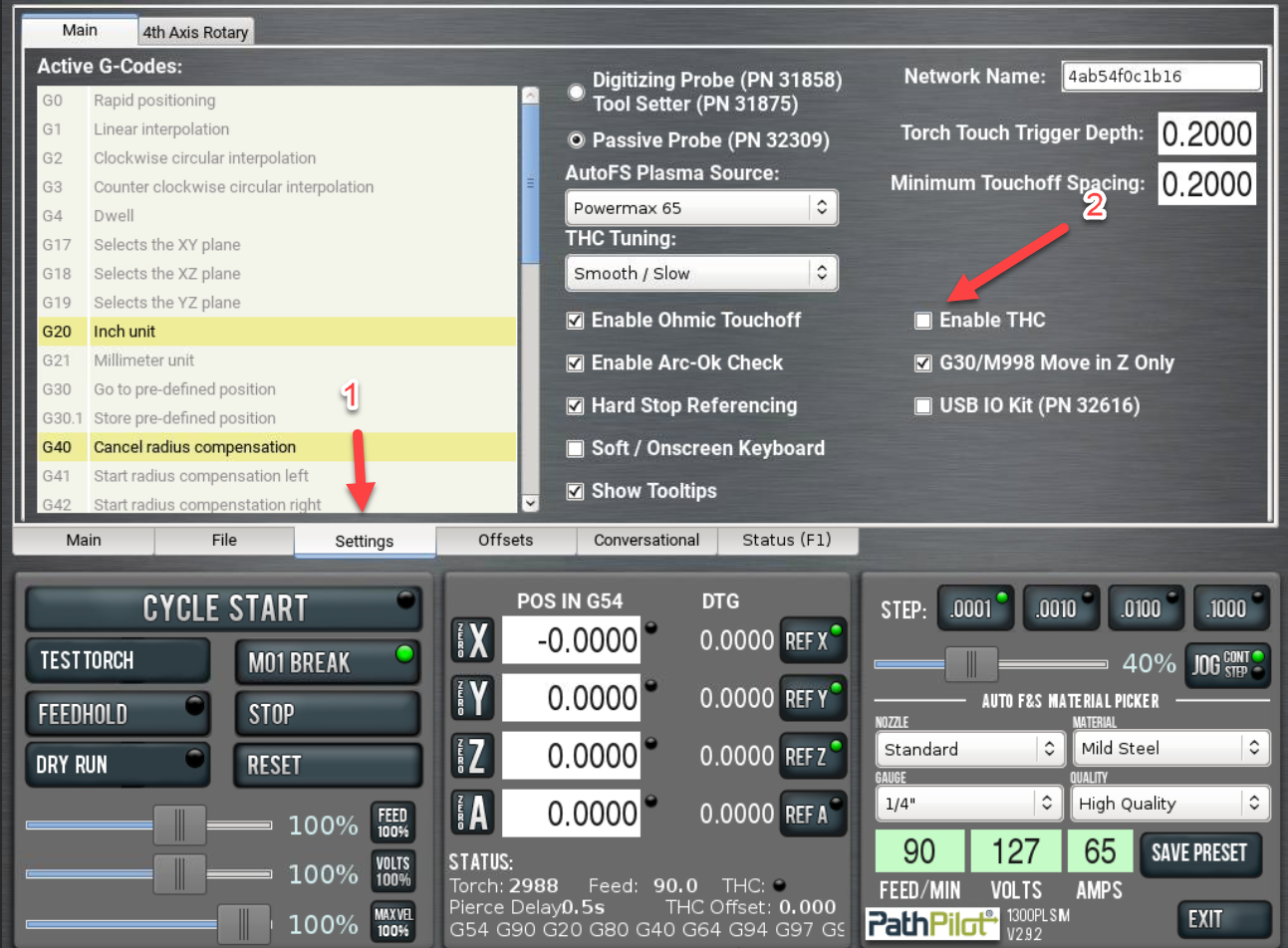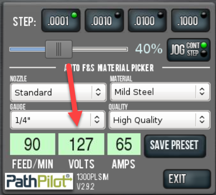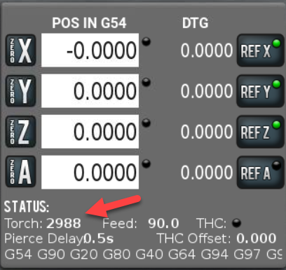 With THC disabled, make a test cut. While the cut is in progress, pay attention to the lower center of the PathPilot screen watch what voltage your torch cuts at. Remember this value.