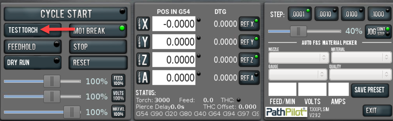 If you are using ohmic touchoff, and your consumables are dirty or get wet, this can falsely trip the ohmic probe. You can attempt to clean out the consumables by using the Test Torch button in PathPilot. This will fire torch wherever it currently rests. So, if you have a good piece of material you don’t want damaged, use this button off to the side.