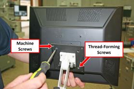 Attach the bottom of the monitor to the VESA mount plate with a Phillips screwdriver and two M4 × 10 mm thread-forming screws.