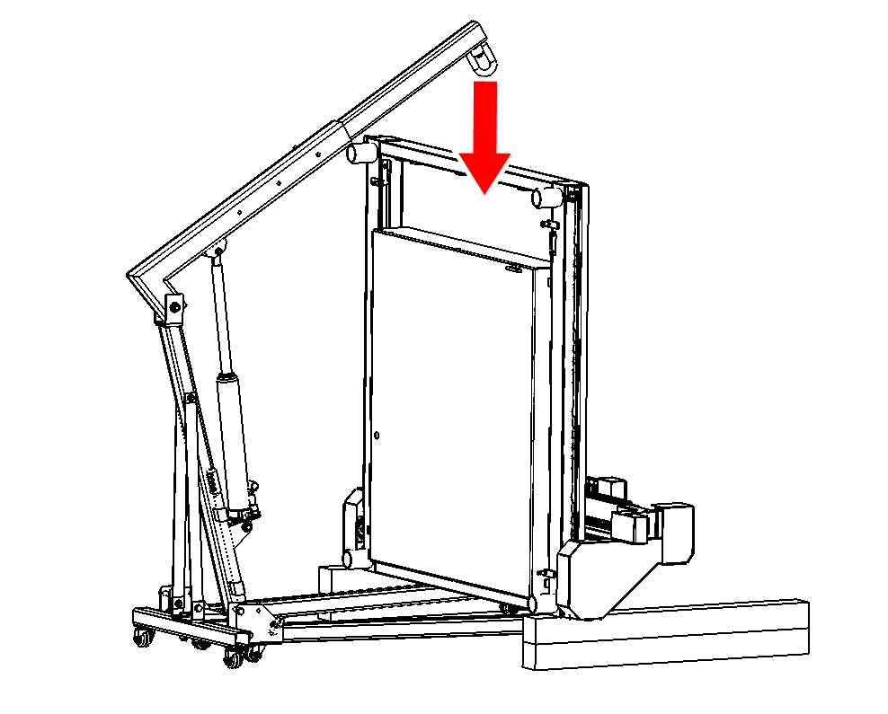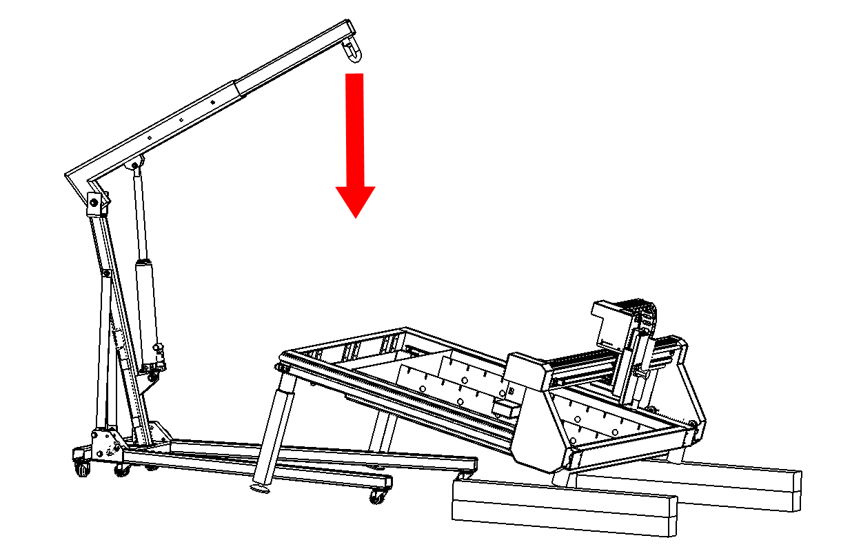 Using gantry crane, slowly lower the top side of the machine frame until the two legs are on the ground.