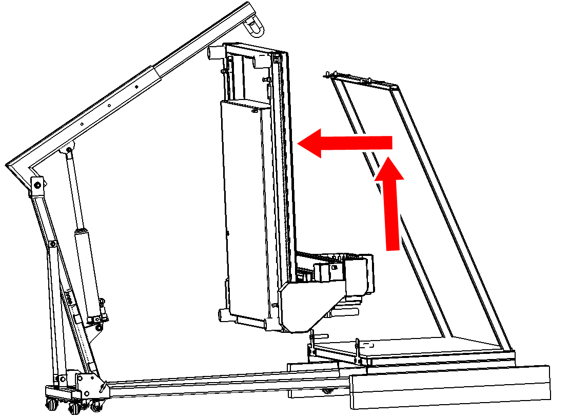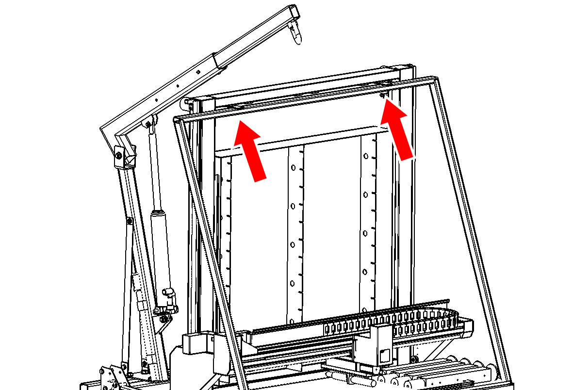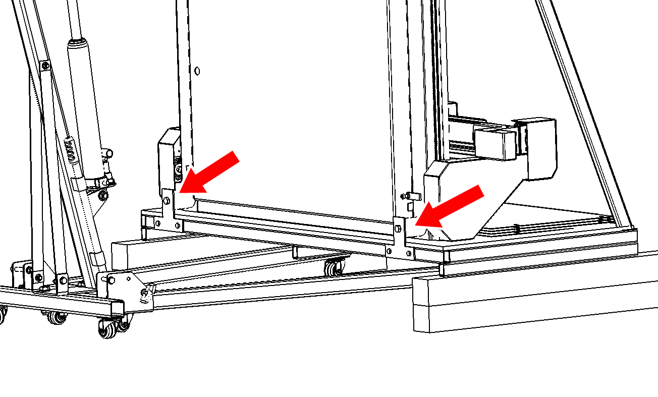 Remove the top two bolts holding the A-frame support of the crate to the machine frame.