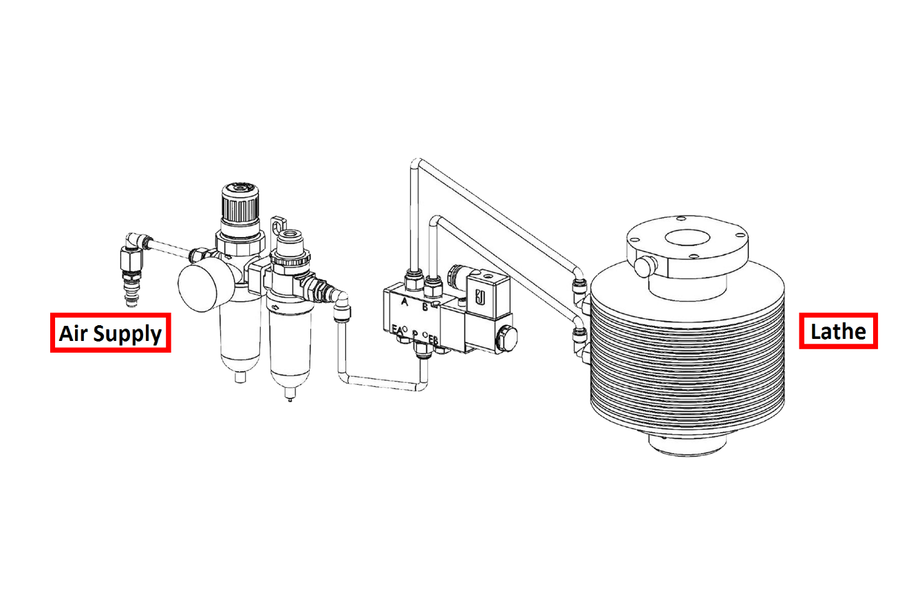 Connect the loose end of the shortest air tube to the output port on the FRL Filter-Regulator-Lubricator.