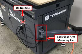 WARNING! Crush Hazard: Only install the Controller Arm on the mounting pad at the front end of the machine. If there's a mounting pad next to the electrical cabinet on the machine stand, don't use it. If you do, there's a risk of entrapment between the Controller Arm and the machine's moving parts.