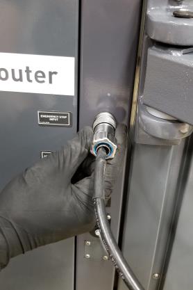 Connect the cable from the operator box to the Emergency Stop Input port on the front right end of the electrical cabinet. Tighten the locking collar to secure the cable.