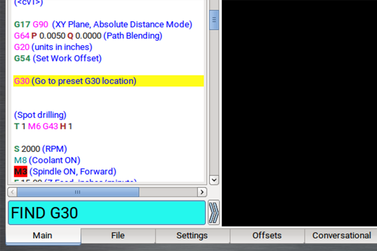 You can use PathPilot to search the text of a G-code program file for specific numbers, codes, or other items of interest (like tools, feeds, and speeds).