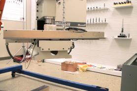 To allow room to position the engine hoist, you must first trim the pallet: cut the machine's pallet along the sides of the machine's base casting with a reciprocating saw (or similar).